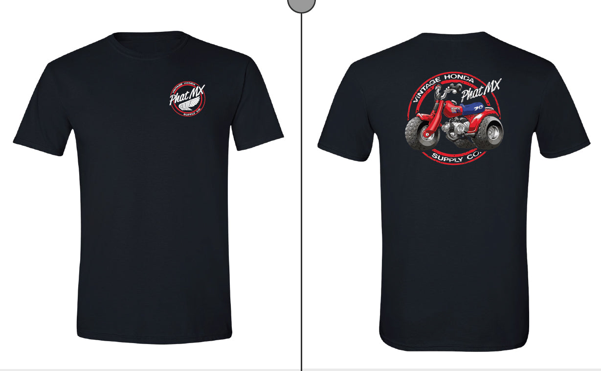 100% cotton Black T-shirt with a front left PMX logo and a ATC70 Ringer logo on the back!!