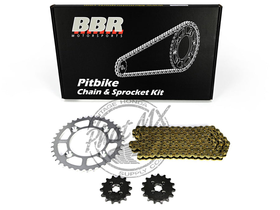 New! - includes 4 sprockets - BBR chain and sprocket kit for the CRF110F. Includes Works style 38 & 40 tooth aluminum rear sprocket, 14T & 15T steel countershaft sprockets, and a heavy duty 120 link gold chain. Perfect as an upgrade to the OEM components or to replace worn out parts.