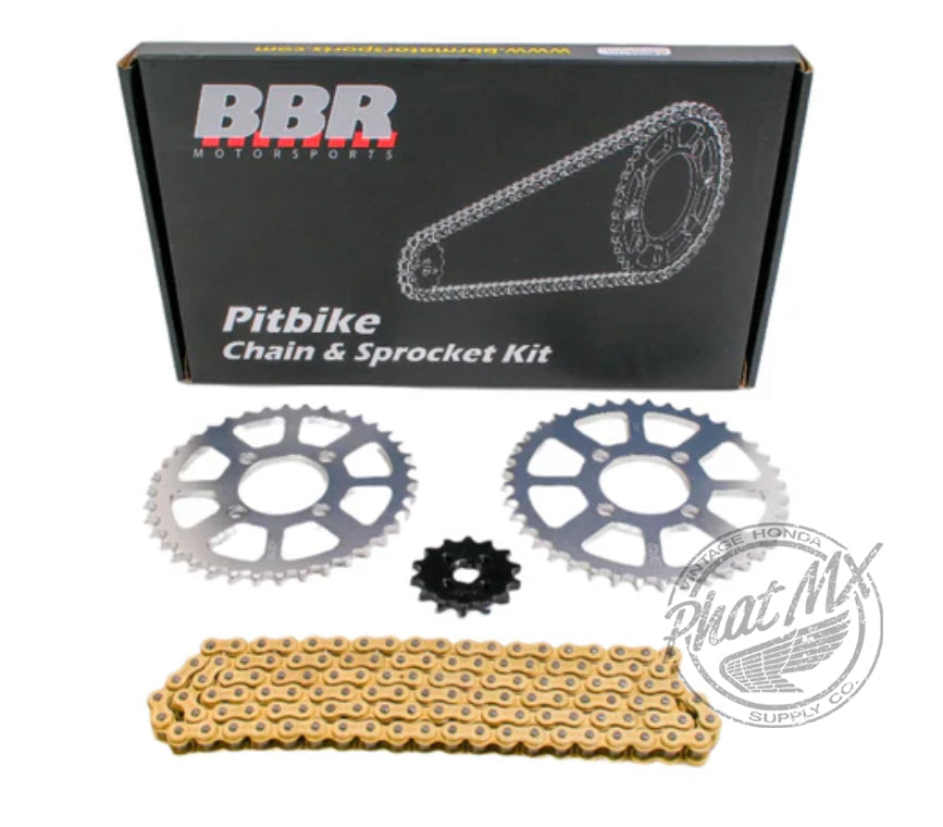 BBR chain and sprocket kit for the KLX110 & KLX110L. Includes Works style 38 & 40 tooth aluminum rear sprocket, 14T steel countershaft sprocket, and a heavy duty 120 link gold chain. Perfect as an upgrade to the OEM components or to replace worn out parts.