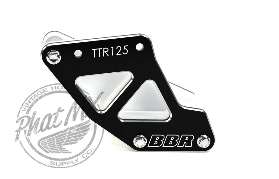 We've increased the thickness of the aluminum side plates and given it a modern look with see through cutouts. That allows for quickly clean out of crud - plus it looks like modern big-bike style chain guides. The side plates are anodized in black with a silver chamfer and the "BBR" logo is laser etched. Modern, dished flange-head bolts replace the button head allen bolts of the old design. HDPE plastic feeds the chain onto the rear sprocket to prevent tossing the chain. Tossed chains often result in broken engine cases - not to mention lost races.