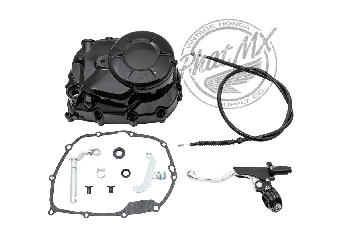 CRF110 Manual Clutch Kit for use with all semi automatic CRF110s. Starting out with the new Gloss Black right hand clutch cover. The clutch arm on/inside the case utilizes a greased needle bearing for smoother action. Includes a crank shaft and Kickstart shaft seal that have been pressed into the cover here saving you the hassle. Everything else needed (except new engine oil) is included: clutch cover gasket, clutch cable bracket, clutch cable, and a high quality adjustable on the fly clutch lever.