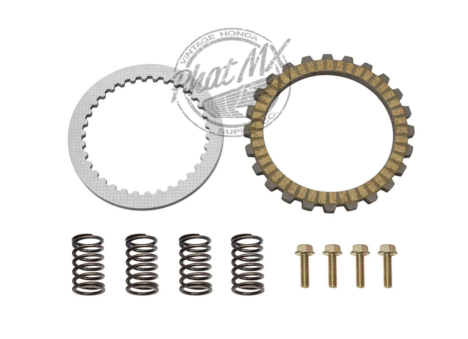HD clutch plate kit for the Honda CRF125. This kit was designed to hold more power from the ground up! We upgraded the OEM cork and rubber fibers to Kevlar for improved grabbing power. Along with that improvement, it uses dimpled steel plates for additional friction. Finally, the springs are 20% heavier than OEM springs. It’s enough to hold big power with performance upgrades, but not too stiff where it makes the clutch pull harsh.