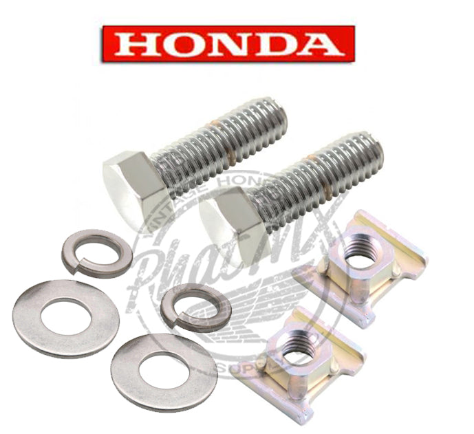 Includes: 2 Chrome Honda Bolts, 2 Honda "H" Nuts, and 2 stainless steel lock washers and flat washers.