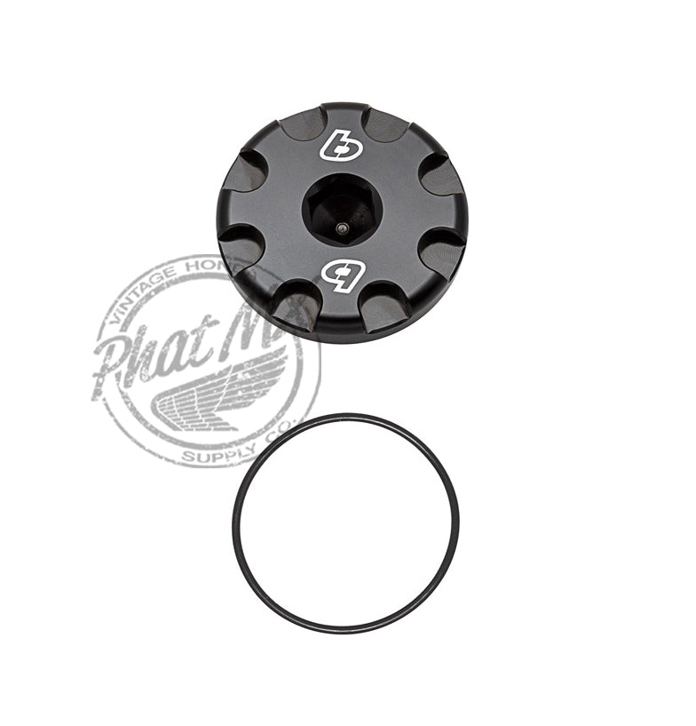 Oil fill cap for all KLX110s. Billet aluminum, CNC finished, hard anodized black with TB logos.