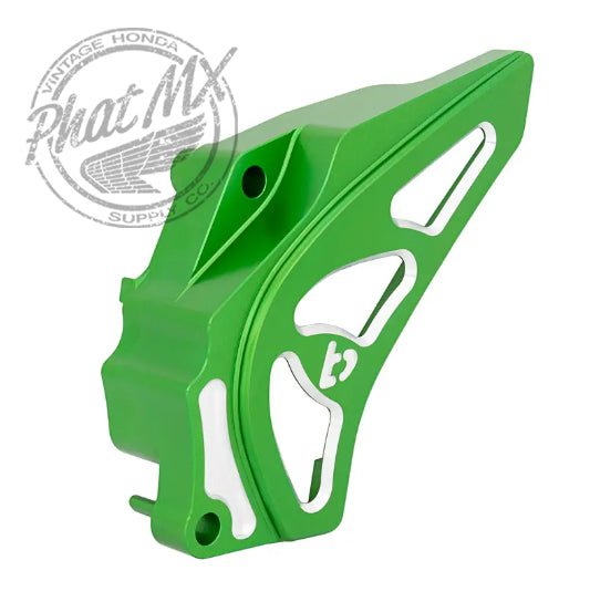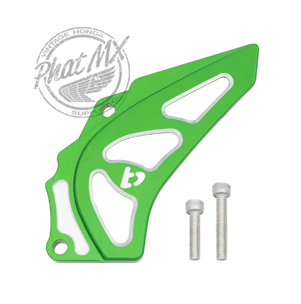 CNC billet sprocket guard anodized green for Kawasaki KLX140s. CNC finished out of billet aluminum, anodized green, and engraved TB logo. Machined windows keep weight down and make cleaning easier. Perfect fit, HD, high quality, and looks 10/10.