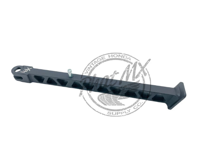 13″ overall length to be used with the “full mod” KLX110 builds. Extended 1.75″ over the stock L model kickstand, or 3.5″ over from the 02-Current standard model. The stainless steel adjustment screw allows the kickstand to fine-tune the positioning of the kickstand to eliminate interference with aftermarket swingers. CNC machined from 6061 Billet Aluminum, and Tig welded footplate.