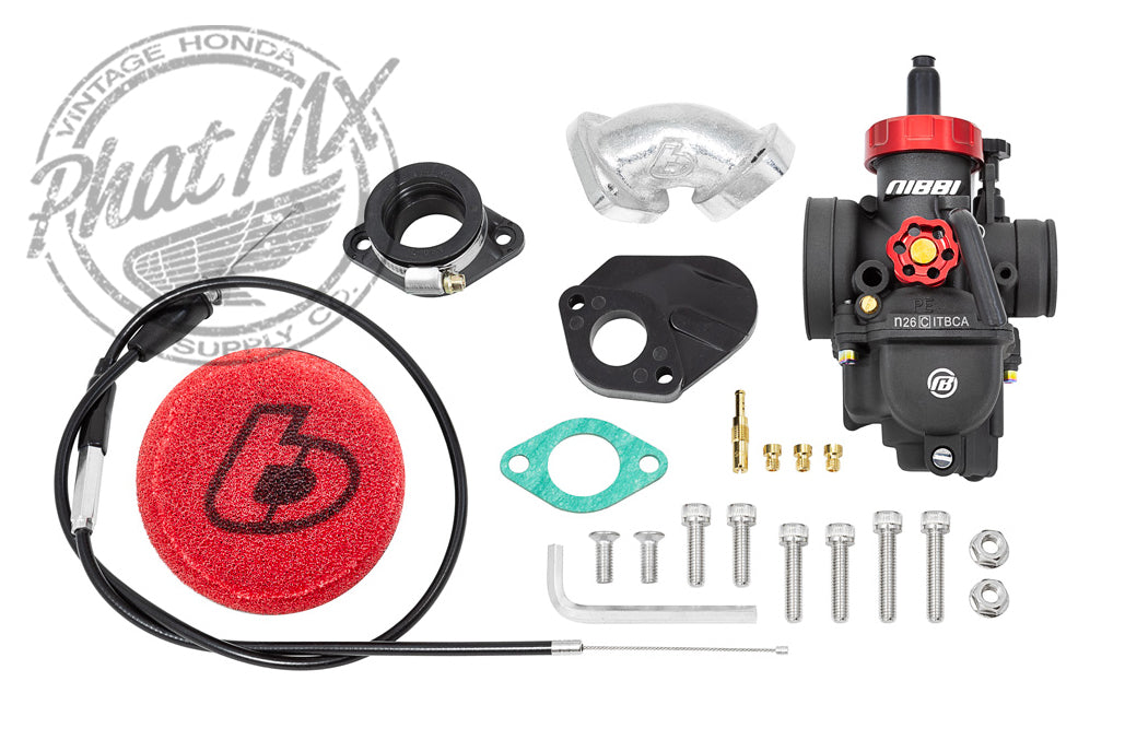 Nibbi helped perfect the simple design of the PE26. Starting with looks, they come hard anodized black. This helps with corrosion resistance, wear resistance, insulation, heat resistance and hardness/strength of the carburetor. The air passage starts out anodized then transitions into a smooth polished finished for optimal power and smooth consistent power. The lightweight hardware is also anodized. Another huge benefit is the splash guard. It keeps the engine operating smooth under bumpy riding. Making them an AMAZING value overall! Paired with the large intake manifold for Honda V2 size race heads. This will give you some of the best throttle response and consistent reliable power on the market! We also include a low profile air filter and extended throttle cable for use with Honda CR style throttles.