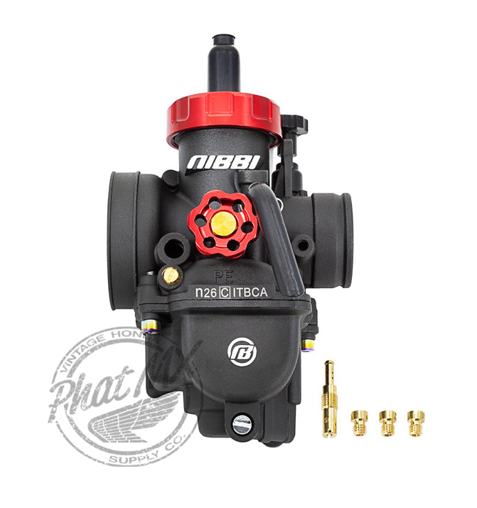 Nibbi PE26 Carburetor. Nibbi helped perfect the simple design of the PE26! Starting with looks, they come hard anodized black. This helps with corrosion resistance, wear resistance, insulation, heat resistance and hardness/strength of the carburetor. The air passage starts out anodized then transitions into a smooth polished finished for optimal power and smooth consistent power. The lightweight hardware is also anodized. Another huge benefit is the splash guard. It keeps the engine operating smooth under bumpy riding. Making them an AMAZING value overall!