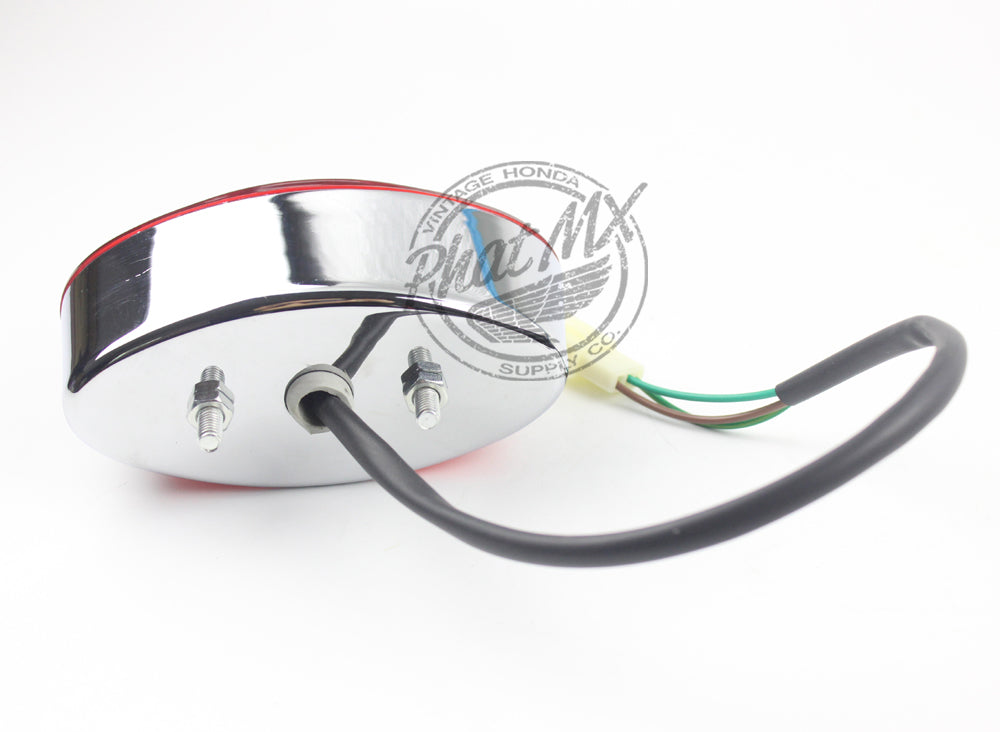 12 volt tail light that mounts to the rear carrier rack for the Honda Z50 that we also sell. DOES NOT plug into the factory harness - you will need to hard wire the wires. Plastic Chrome base.