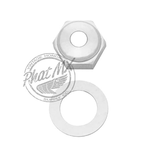 Reproduction steering stem nut and washer that is used on variety of Honda models. The Nut has a hole used for the gas breather tube. This part is often rusty and pitted making it nearly impossible to properly restore or have re-chromed.