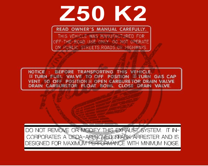 Reproduction decals for the Honda Z50 K2 1971 (oval tank logo) hardtail.