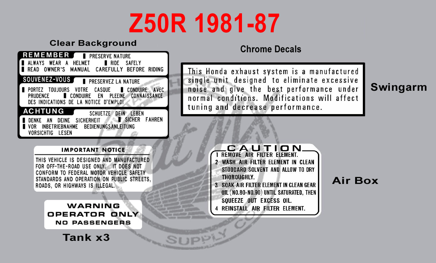 Reproduction warning decals for the Honda Z50R 1981-1987. Sold as a kit or separately.